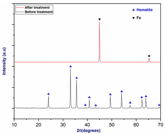 According to the XRD spectrum shown in Figure 13, the peaks associated with the raw material correspond to the hematite structure [44]. Following plasma treatment, hematite was reduced to metallic iron in the conical section of the reactor, where the partial pressure of oxygen was very low and the temperature reached over 3000 °C [45]. As in the previous example with magnetite, the observation of peaks at 45° and 65° indicates the production of metallic iron [46].