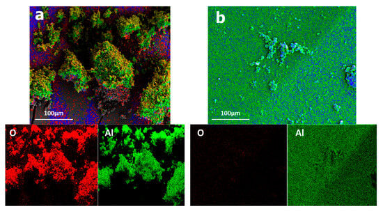 Elementary repartition of alumina elements (a) before plasma treatment and (b) after plasma treatment.