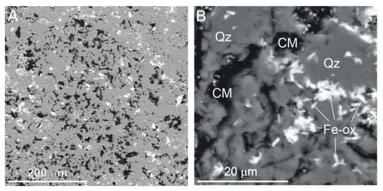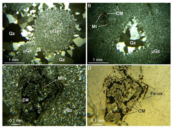 Figure 4A,B). This is evident by irregular fine alternation of xenomorphic quartz grains, carbonaceous matter, and iron oxide inclusions. The quartz grain boundaries are unclear; grain size ranges from a few tens of micrometers to smaller. Micrometer-sized segregations of carbonaceous matter resemble a lithified liquid, which fills open space between quartz grains. Iron oxides occur predominantly as needle-like or laminar aggregates (