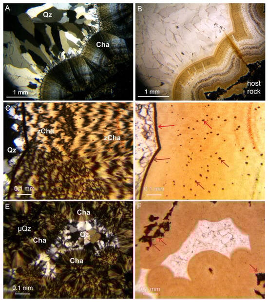 Figure 3A,B,D). Locally, fissures and cavities are filled by quartz-chalcedony aggregates smoky-black in color (