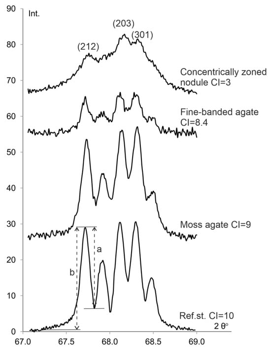 13]. It is suggested that an increasing of crystallite size and crystallinity index in agates is the result of the transformation of fibrous silica phases (chalcedony and moganite) to granular alpha quartz during late metamorphic alteration [