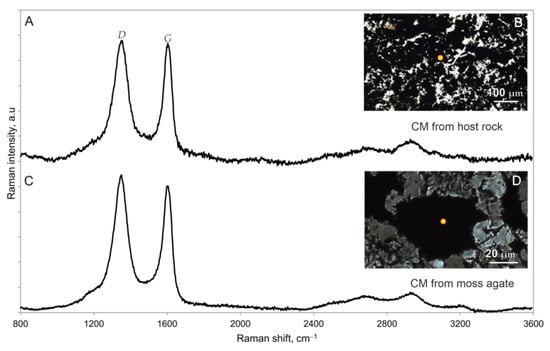 78]. The origin of carbonaceous matter in agates is uncertain. For example, it is assumed that the inclusions of carbonaceous matter in Mali agates might originate from both the hydrothermal formation of graphite from methane under elevated temperature, and graphitization of organic precursors by secondary hydrothermal and metamorphic overprint [