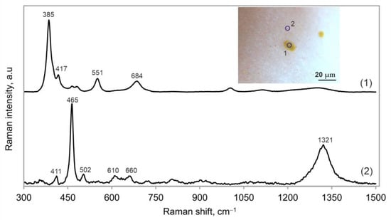 The Raman peak parameters (position, area, and width (i.e., full-width at half maximum (FWHM))), were measured using OMNIC for dispersive Raman software v.8.2. (Thermo Fisher Scientific, Waltham, MA, USA). For silica phases, the curve-fitting algorithm was used to fit the spectra with Lorentzian functions in the 400–550 cm