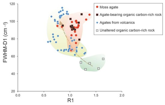 Figure 14). It is noteworthy that carbonaceous matter from previously studied black agates hosted in LSH volcanic rocks has a similar FWMH-D1 parameter and slightly lower values of the R1 parameter (with high scattering of both parameters) compared to carbonaceous matter recorded in moss agate and host rock (