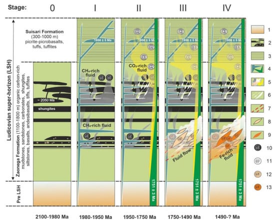 The duration of Stage IV is the most controversial. The presence of hydrothermal zircons aged at 1100 to 200 Ma in the ZF volcanic-sedimentary rocks indicates that in the Neoproterozoic-Phanerozoic, the Onega Basin experienced large-scale, long-term fluid-metasomatic reworking [