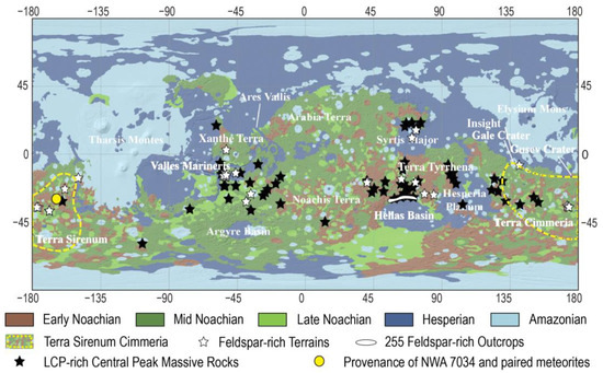 - Phillips, M.S.; Viviano, C.E.; Moersch, J.E.; Rogers, A.D.; McSween, H.Y.; Seelos, F.P. Extensive and Ancient Feldspathic Crust Detected across North Hellas Rim, Mars: Possible Implications for Primary Crust Formation. Geology 2022, 50, 1182–1186. [Google Scholar] [CrossRef]