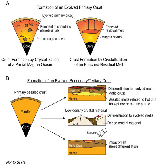 | Secondary evolved crust | Re-melting of a hydrated basaltic crust through hot melts extracted from a mantle plume, and fractional crystallization | Large- to global-scale evolved crust | Sub-alkaline calc–alkaline intermediate and felsic rocks with water-bearing minerals such as mica, amphibole, and OH-apatite. Possibly granitic/dioritic intrusions. |