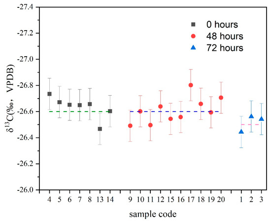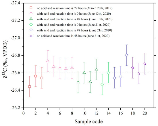 On account of speleothem, carbonate subsamples need to be completely digested, and hence, enough reaction time is essential. Generally, according to different concentrations of DOC in various speleothems, 100–500 mg of carbonate should be prepared so that enough gas CO2 reaches the limitation for detecting δ13CDOC [9,15]. Previous tests suggested a digestion time of 48 h is generally enough [15], therefore we set 0, 48 h, and 72 h (digestion time occasionally may exceed 48 h) to inspect whether the digestion time affects the δ13CDOC of study samples.