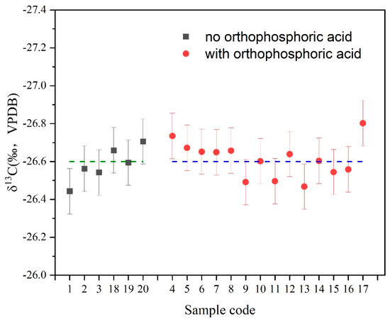 The δ13CDOC results from a comparison between samples with and without orthophosphoric acid. The green and blue dashed lines represent the average values of without and with orthophosphoric acid, respectively.