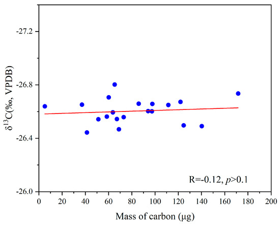In addition, it is well known that samples with a higher content of carbon are less susceptible to their carbon isotope composition from exogenous contamination because, even if there is contamination, its proportion is relatively low. The opposite is true for samples with low carbon content. Specifically, if there is contamination with carbon, the final δ13CDOC could increase or decrease with the decrease in carbon mass in the study samples. To further clarify the possibilities of contamination, we therefore compared the mass of carbon in different samples and their δ13CDOC. The comparison shows that there is no correlation between the amount of carbon and δ13CDOC (Figure 4), further indicating that the carbon isotopic compositions of DOC in speleothem are not affected by contamination.