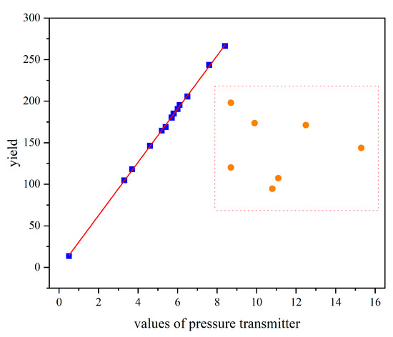 The versus between the values of pressure transmitter and yield of CO2. The CO2 from those samples (yellow circles) was released from the storage vessel in advance under equilibrium conditions before analysis.