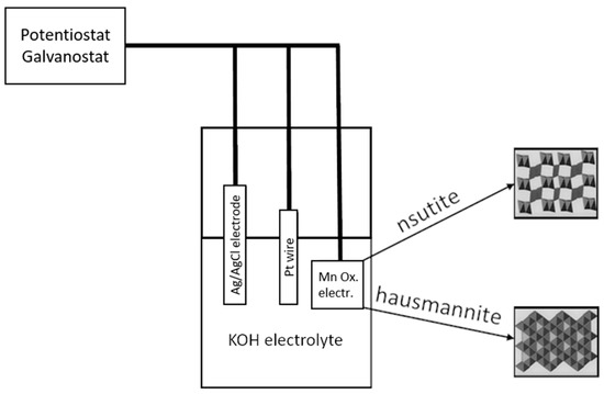 A VersaSTAT 3 Potentiostat Galvanostat (AMETEK, Inc., Berwyn, Pennsylvania, USA) and the VersaSTAT software (version 2.63.3.0) were used for the cyclic voltammetry (CV) and charge–discharge (CDC) measurements. The measurements were extracted using a three-electrode single-compartment cell, including an Ag/AgCl electrode (reference electrode), a Pt wire (counter-electrode), and the prepared materials of hausmannite and nsutite (working electrodes) at room temperature under Ar conditions (Figure 1).