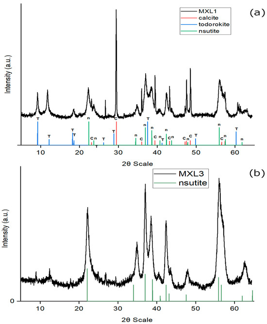 A structural analysis of the samples was carried out using pXRD and is given in Figure 1 and Table 1. The XRD of MXL1 (Figure 2a) shows a predominant peak at a 2θ value of 29.5° which, together with the peaks at 23.1°, 36°, 39.4°, 43.16°, 47.13°, 47.51°, 48.51°, corresponds to the mineral phase of calcite (CaCO3). Apart from calcite, strong peaks appear at 2θ values of 9.23°, 12.2°, 18.2°, 37.52°, and 60.28°, which are attributed to the crystal planes of todorokite. Lastly, the 2θ values of 22.14°, 34.75°, 36.86°, 38.8°, 40.36°, 42.26°, 43.3°, 55.95°, 56.66°, and 62.59° were attributed to the mineral phase of nsutite [6,36,37,38].