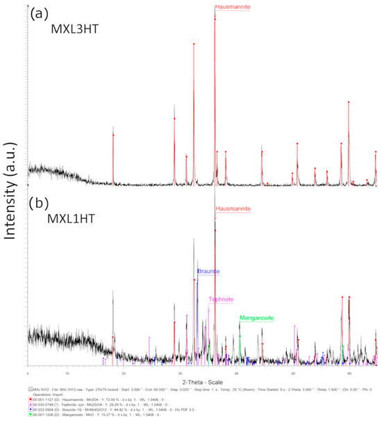 X-ray diffraction analysis was carried out after the heat treatment of both samples (Figure 4). The results indicated that the sample containing only nsutite (MXL3) successfully transformed into a well-crystallized hausmannite (Figure 4a) [39]. In contrast, the MXL1 sample (Figure 4b) transitioned not only into hausmannite but also into mineral phases like braunite ([Mn2+Mn3+]6[SiO4]O8), tephroite ([Mn2+]2SiO4), and Manganosite (MnO). This occurrence is likely due to the presence of manganese oxides (todorokite and nsutite) in conjunction with calcite (CaCO3) and quartz (SiO2) in the specific sample, which may act as catalysts in the development of manganese silicates, meaning the samples of manganese oxides that contain matrix calcite and quartz need to be separated first and then undergo heat treatment in order to transform into hausmannite successfully.