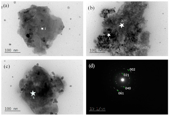TEM images of manganese oxides from the sample of MXL3c. (a–c) are different grains of the MXL3 sample, and (d) is a selected area electron diffraction pattern of (a) that shows the d spacing of the selected grain. Star-shaped symbols indicate where the energy dispersive spectra was taken. In all the images, two different phases of manganese oxides are present: dark grey represents the phase of nsutite, and dark spheroids represent the mineral phase of coronadite.