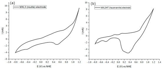 Cyclic voltammetry and charge–discharge tests were conducted to characterize the electrochemical performance of nsutite and hausmannite composites. Figure 6 shows the cyclic voltammograms of MXL3 (nsutite) and MXL3HT (hausmannite) electrodes with a scan rate of 50 mV/s in a potential window of (−0.8, 1.2) and (−0.8, 1.2), respectively, using as reference electrode Ag/AgCl and Pt as the counter electrode. The two electrodes show a noticeable deviation from each other due to the different nature of the material. Apropos the cyclic voltammetry, experiments were carried out to investigate the redox processes at the electrodes. In MXL3 and MXL3HT voltammograms, the anodic peaks of +0.83 V (MXL3) and +0.85 (MLX3HT) and the cathodic peaks of +0.48 V (MXL3) and +0.35 V (MXL3HT) correspond to the oxygen evolution (OER) and oxygen reduction (ORR) reactions [40].
