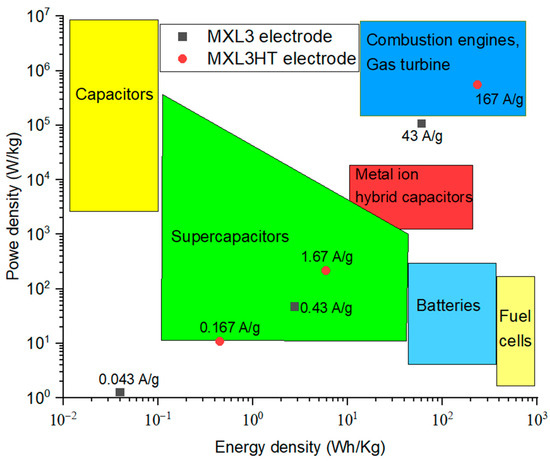 The energy and power densities were then graphed on a Ragone plot (Figure 8) to identify the most suitable application for these electrodes [47].