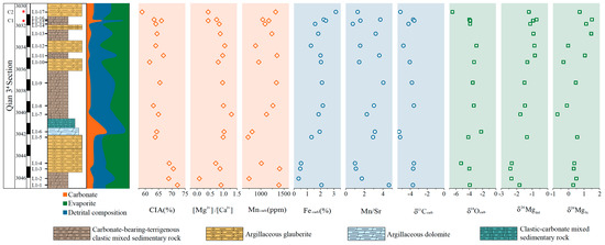 The basement of the Qianjiang Depression comprises Precambrian metamorphic rocks, Silurian to Early Triassic marine sedimentary strata, and Middle Triassic to Jurassic fluvial deposits [47]. The overlying lacustrine strata are the Paleogene Jinghezhen Formation and the Neogene Guanghuasi and Pingyuan formations [49]. The Qianjiang Depression exhibits the highest subsidence rate in the Jianghan Basin. During the deposition of the Qianjiang Formation, the basin underwent intense evaporation, fostering a high salinity level and a closed environmental setting. The salts manifest alternating layers with mixed sedimentary rocks and salt rocks, displaying clear vertical rhythm and consistent lateral continuity. Vertically, the Qianjiang Formation can be further divided into four stratigraphic units, i.e., Eq4 to Eq1 from the bottom to top. The Qianjiang 2–4 Members primarily comprise alternating layers of halite-glauberite, carbonate, and shale in the depocenter of the Qianjiang Depression [50]. Typically, carbonate sedimentation occurs in situ within lacustrine or shallow marine environments, whereas siliciclastic sediment is primarily transported into the system by rivers [51]. Recent studies indicate that the mixed sediments in Qian 34 section (this study) can be divided into two types: siliciclastic-dominated mixed sediment and carbonate-dominated mixed sediment. These variations are indicative of consistent fluctuations in the overall balance between water inflow/outflow [22]. Therefore, the degree of fluvial input and weathering processes affecting mixed sediments in the Qianjiang region varies across different lithologies.