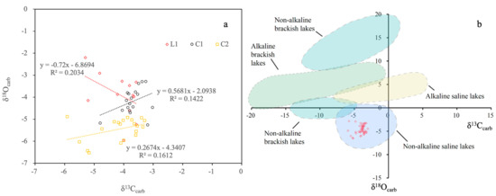 (a) Results of the stable oxygen and carbon isotope analysis of L1, C1, and C2; (b) Results of the stable oxygen and carbon isotope values of L1, C1, and C2 suggest that the Jianghan Basin is a non-alkaline saline lake (modified from Guo et al., 2023 [21]).