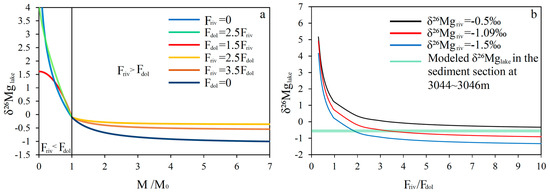 where Δδ26Mgdol-lk represents the Mg isotope fractionations associated with the formation of dolomite. At 25 °C, Δδ26Mgdol-lk is 1.8‰ [82]. The model results are shown in Figure 6a. When Friv > Fdol, the magnesium content (NMg) continues to increase; the Mg isotope composition of the lake would decrease progressively if the influx of riverine δ26Mg was light. When Friv < Fdol, the lake would be enriched in 26Mg during the dolomitization processes. NMg/Friv and NMg/Fdol will affect the model’s result. We constrained this ratio using the centimeter-scale geochemical data of C1 and validated the model, as detailed in Section 5.2.5.