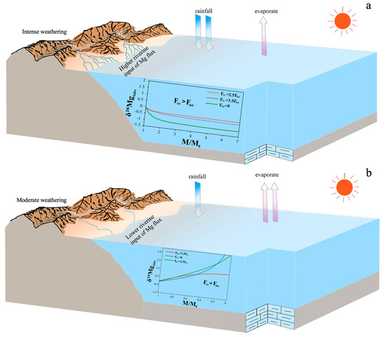 The ratio of the magnesium flux from the river input to the magnesium flux consumed by dolomite sedimentation will affect the rate of change in the magnesium isotope values of the lake water. However, due to the instability of the magnesium isotopes in both the dolomite and detrital components in this interval, it is difficult to deduce specific ratios through steady-state models. In the model depicting the mass balance of the Mg and Mg isotopes in the lake, when Friv < Fdol, the lake tends to be enriched in 26Mg as dolomitization proceeds rapidly (Figure 6a). In addition, this section has relatively low CIA values and higher δ18Ocarb, which suggests a relatively weak weathering intensity and relatively dry climate. Within this section, the lake is in an evaporative state, with the Mg output exceeding the input in the lake water. The dominant dolomite sedimentation will continuously be enriched in 26Mg in the lake water (Figure 7b).