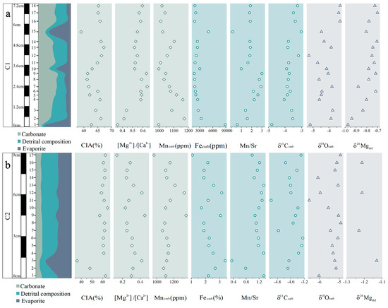 (a) Chemostratigraphic profiles of CIA, [Mg2+]/[Ca2+], [Mn], [Fe], [Mn]/[Sr], δ13Ccarb, δ18Ocarb, and δ26Mgdol values of C1; (b) chemostratigraphic profiles of CIA, [Mg]/[Ca], [Mn], [Fe], [Mn]/[Sr], δ13Ccarb, δ18Ocarb, and δ26Mgdol values of C2.