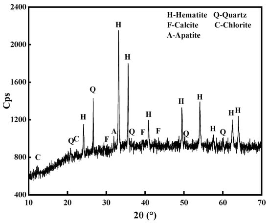 Oolitic hematite samples used in this work were collected from Hubei Province, China. The results of the chemical multi-element analysis are shown in Table 1. Notably, the oolitic hematite sample contains 47.65 wt% TFe (the total iron grade of the sample), 5.67 wt% CaO, 10.79 wt% SiO2, 1.04 wt% MgO, and 6.74 wt% Al2O3. An XRD pattern was conducted to determine the main compositions of this sample. From Figure 1, it is clear that the main valuable mineral is hematite, and the main gangue minerals are quartz, calcite, chlorite, and apatite.