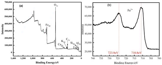 The XPS spectra of raw ores are shown in Figure 2, where Fe 2p, O 1s, and C 1s are the main components in raw ores (Figure 2a). As shown in Figure 2b, the doublets at 710.8 and 723.9 eV belong to Fe 2p3/2 and Fe 2p1/2 of Fe3+ [22]. Combined with the XRD results of raw ores (as shown in Figure 1), it could be inferred that the primary iron oxide in raw ores is Fe2O3.