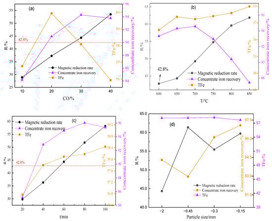 The effects of roasting conditions on magnetic separation: (a) CO concentration, (b) roasting temperature, (c) roasting time, and (d) particle size.