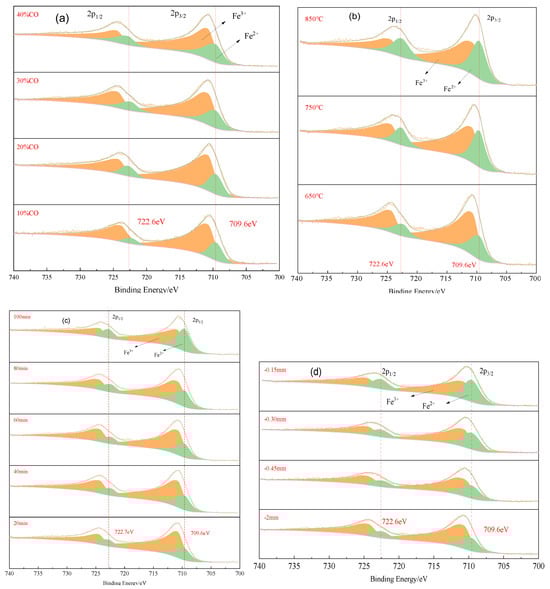 The high-resolution spectrum of Fe 2p under different conditions: (a) CO concentration, (b) roasting temperature, (c) roasting time, and (d) particle size.
