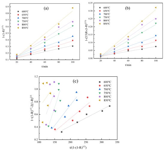 Magnetization reduction kinetics fitting with three control models at a particle size of −0.15 mm: (a) chemical reaction control; (b) internal diffusion control; and (c) hybrid control.