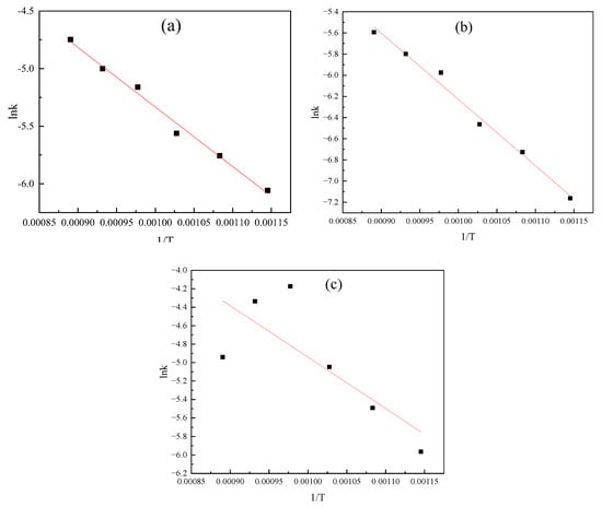 Arrhenius plot of data in different control models at a particle size of −0.15 mm: (a) chemical reaction control; (b) internal diffusion control; and (c) hybrid control.
