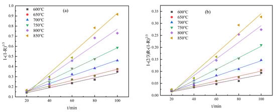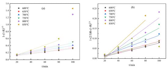 Similarly, the kinetics of magnetization reduction of oolitic hematite with a particle size of −0.30 mm are fitted according to Equations (3) and (4). The results are presented in Figure 7. In addition, Figure 8 shows the apparent activation energy of two control models obtained by fitting lnk against 1/T. The squared correlation coefficients and apparent activation energy calculated from the fitting curves are summarized in Table 5 and Table 6, respectively.