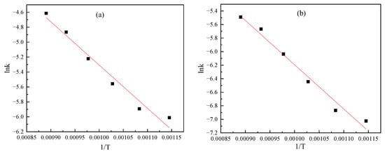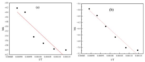 Arrhenius plot of data in different control models at a particle size of −0.30 mm: (a) chemical reaction control; (b) internal diffusion control.