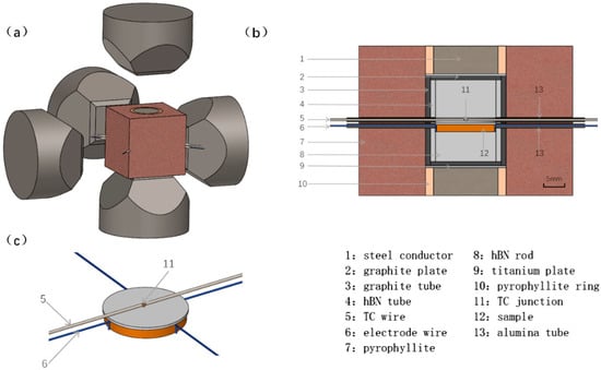 (a) Schematic diagram of the assemblage and large-volume press technique for electrical resistivity measurement at a high pressure and high temperature. (b) Cross-section view of the experimental configuration, showing the cell assembly with the sample, electrodes, and thermocouple. (c) Enlarged view to show the position of the thermocouple (TC) junction and the contact mode between the sample and electrodes.
