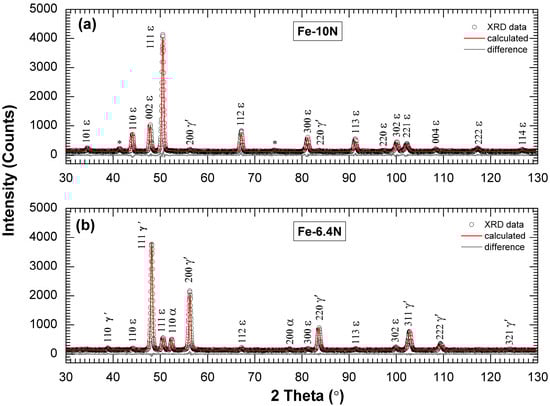 X-ray diffraction data of the synthesized samples showing ɛ (a) or γ’ (b) as the dominant nitride phase. The diffraction data, Rietveld refinement fits, and their difference are represented by black circles, red, and dark gray lines, respectively. Peaks of trace wüstite are marked with asterisks.