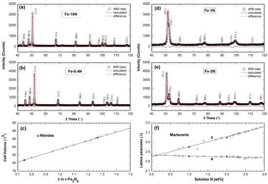 - Liapina, T.; Leineweber, A.; Mittemeijer, E.; Kockelmann, W. The lattice parameters of ε-iron nitrides: Lattice strains due to a varying degree of nitrogen ordering. Acta Mater. 2004, 52, 173–180. [Google Scholar] [CrossRef]