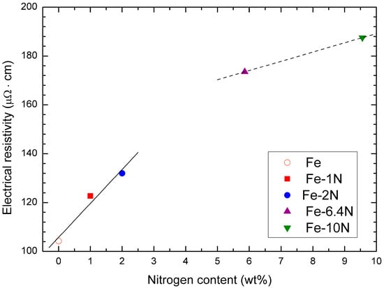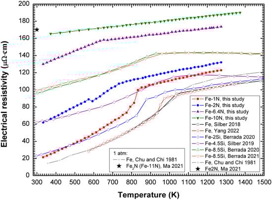 Comparing the effects of N and Si, N has a stronger effect on resistivity than Si (Figure 4). Fe–1N exhibits resistivity similar to Fe–4.5 wt%Si, and both Fe–1N and Fe–2N most likely have higher resistivity than Fe–8.5 wt%Si due to its negative temperature dependence at high temperature. The resistivity of the Fe–8.5 wt%Si alloy is ~20% and ~25% lower than nitrides Fe–6.4N and Fe–10N at 1273 K, respectively. The difference is enhanced when extrapolating to higher temperatures due to the negative temperature dependence of the solid Fe–Si alloys.