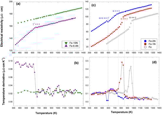Figure 6c,d show the changes in the temperature derivative of the resistivity at ~955 K for pure Fe, ~853 K for Fe–1N, and ~753 K for Fe–2N. These changes correspond to the onset of the polymorphic transition γ ↔ α [14,15,24,25,26,33,82,89,90]. The transition temperature decreases with the increasing N content, defining the γ ↔ α + γ phase boundary (Figure 7b). Below the polymorphic transition temperature, a discontinuity is observed at ~593 K in the Fe–2N resistivity, likely attributed to the eutectoid reaction of γ’ ↔ α + ɛ. This decomposition reaction was theoretically predicted by Göhring et al. [74] (Figure 7a) but it has never been directly observed in experiments, possibly due to the sluggish reaction at low temperature.