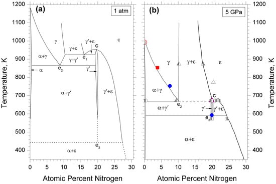 - Wetzel, M.; Rabending, T.; Friák, M.; Všianská, M.; Sob, M.; Leineweber, A. Phase stability of iron nitride Fe4N at high pressure-pressure-dependent evolution of phase equilibria in the Fe-N system. Materials 2021, 14, 3963. [Google Scholar] [CrossRef] [PubMed]