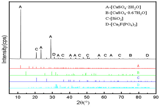 The PG samples used in this study are collected from the PG produced during the production of phosphoric acid through a wet process (the so-called “dihydrate process”) by a phosphate fertilizer manufacturing company in Yichang, Hubei Province of China. The collected samples are dried to a constant weight in a drying oven at 45 °C via a standard sampling method and then placed in a desiccator for storage. The composition of the mineral phase was analyzed and determined using XRD and the obtained results are presented in Figure 2.
