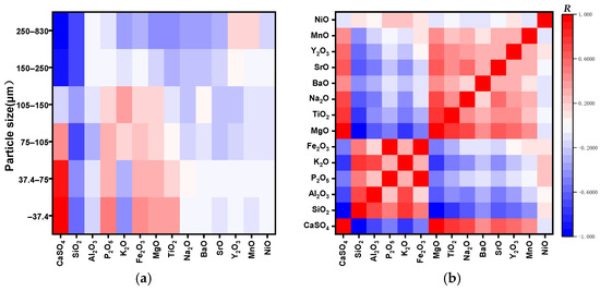 Based on the analysis results of chemical elements in PG with various particle sizes, Pearson’s correlation coefficient could be used to analyze the correlation between chemical elements in PG and investigate the effect of PG particle size on the occurrence of chemical elements. The results of the analysis are presented in Figure 3.