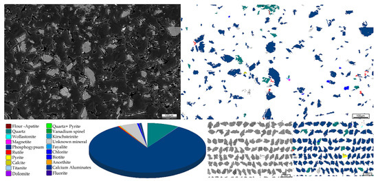 The automatic mineral analysis system is able to realize the quantitative analysis of the mineral phase composition in the target mineral. In the current investigations, the AMCIS automatic mineral analyzer is employed to examine the mineral phase composition and content in PG. The schematic representation of the analysis process is provided in Figure 5.