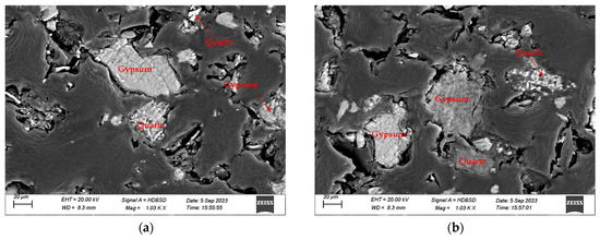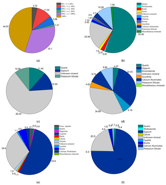 The mass distribution of particles with various gypsum contents is illustrated in Figure 7a. The gypsum content in PG particles is generally high, and the ratio of particles with 80%–100% gypsum content reaches 78.07%, whereas the mass ratio of gypsum minerals in the form of completely separated monomer minerals is 44.97%. Further, the particles containing 20%–40% gypsum contain 11.02% and the amount of gypsum in other particles is less than 6%. It can be seen from Figure 7b that the mass ratio of quartz minerals in solid impurities of PG is 55.56%. For potassium silicate and unknown minerals in solid impurities, the corresponding mass ratio is 10.28% and 20.05%, respectively. It can be seen from Figure 7c that the mass ratios of quartz minerals, potassium silicate minerals and unknown minerals in order are 11.45%, 10.56% and 65.43% in interconnected minerals with 0%–20% content. Figure 7d displays that the mass ratio of quartz minerals with a gypsum content of 20%–40% is substantially lower than that of gypsum of 0%–20%, which is only 4.07%, 34.65% in unknown minerals and 8.85% in potassium silicate minerals. Figure 7e also demonstrates that the mass ratio of quartz in the conjoined mineral with 40%–60% gypsum content is only 0.82%, the unknown mineral is 29.60% and that of the biotite mineral is 5.63%. Figure 7f illustrates that the mass ratio of quartz mineral in the conjoined mineral with 60%–80% gypsum content is 0.81%, which is similar to that in the conjoined mineral with 60%–40% gypsum content. The mass ratio of unknown minerals is 20.48% and biotite minerals is 1.84%.