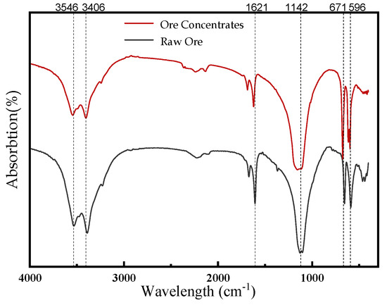FI-TR analysis was performed on the original sample of PG after quality and whiteness improvement using manual flotation with acid pickling. As demonstrated in Figure 8, the intensity of the distinctive O-S-O absorption peaks at 596 cm−1 and 671 cm−1 is higher in the “positive flotation + acid washing” coupling procedure for treating PG than in the original PG sample. This improvement might result from CaSO4·2H2O being the primary ingredient in the test sample [35,36]. Following the coupling process treatment, the concentration of CaSO4·2H2O rises considerably, which significantly enhances the distinctive O-S-O absorption peaks in the 400–700 cm−1 range. Furthermore, at 1142 cm−1, a notable enhancement in the intensity of the distinctive absorption peak of the anti-symmetric stretching vibration of SO4 is detected in the CaSO4·2H2O crystal molecule [37].