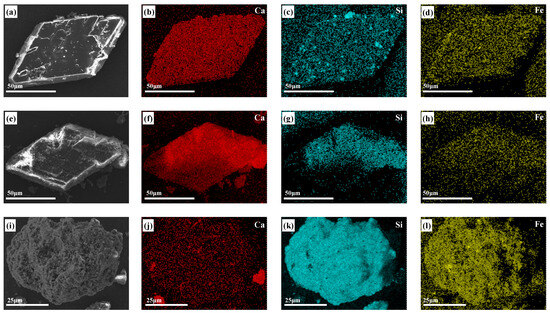 Figure 9. SEM-EDS mapping analysis results of original PG sample, flotation concentrate, and tailings: (a,e,i) SEM images of test samples, (b,f,j) mapping analysis results of Ca element in test samples, (c,g,k) mapping analysis results of Si element in test samples, (d,h,l) mapping analysis results of Fe element in test samples.