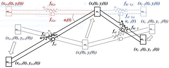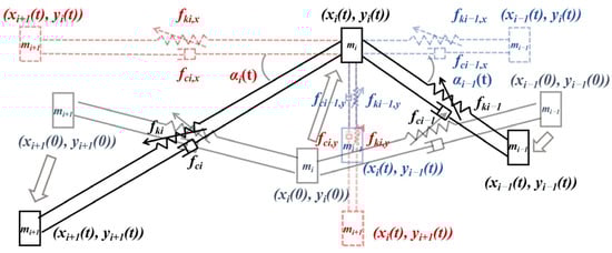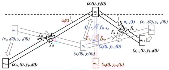 Because the motion of the ith mass block is affected by the (i − 1)th and (i + 1)th mass blocks, we apply D’Alembert principle to list the mechanical expressions for the ith mass block in the x-direction and y-direction. Figure 4 and Figure 5 respectively illustrate the force analysis of the ith mass block in the x and y directions at time t.