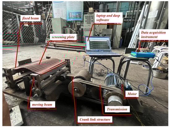 The working process is as follows: First, start the motor, which in turn leads to the motion of the crank link system through the transmission device. Then, the moving beam connected to the crank link system produces periodic motion with an amplitude of 6.8 mm. The periodic motion of the moving beam leads to the FFSP undergoing alternating relaxed and tightening reciprocating motion. During the motion of the screen plate, the acceleration sensor fixed at the midpoint of the screen directly measures the acceleration at the midpoint of the screen surface. The signal is collected by the data acquisition instrument and uploaded to the DASP software on the laptop for recording and analysis.