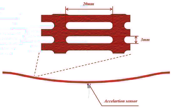 Figure 6 shows an acceleration testing platform, which consists of a FFSP experimental system (motor, transmission device, crank link system, moving beam, FFSP, fixed beam) and a data acquisition system (acceleration sensor, data acquisition instrument, laptop). As shown in Figure 7, the acceleration sensor is fixed at the midpoint of the screen plate.