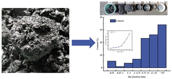 The coal used in this experiment for investigation is bituminous coal from Yangcheng, Shanxi, China. Before conducting the experiments, the coal samples were first subjected to particle size analysis. Using sieves with apertures of 0.25 mm, 1 mm, 3 mm, 4.75 mm, 13 mm, and 25 mm, the dried coal samples were sieved to obtain the particle size distribution of the raw coal.